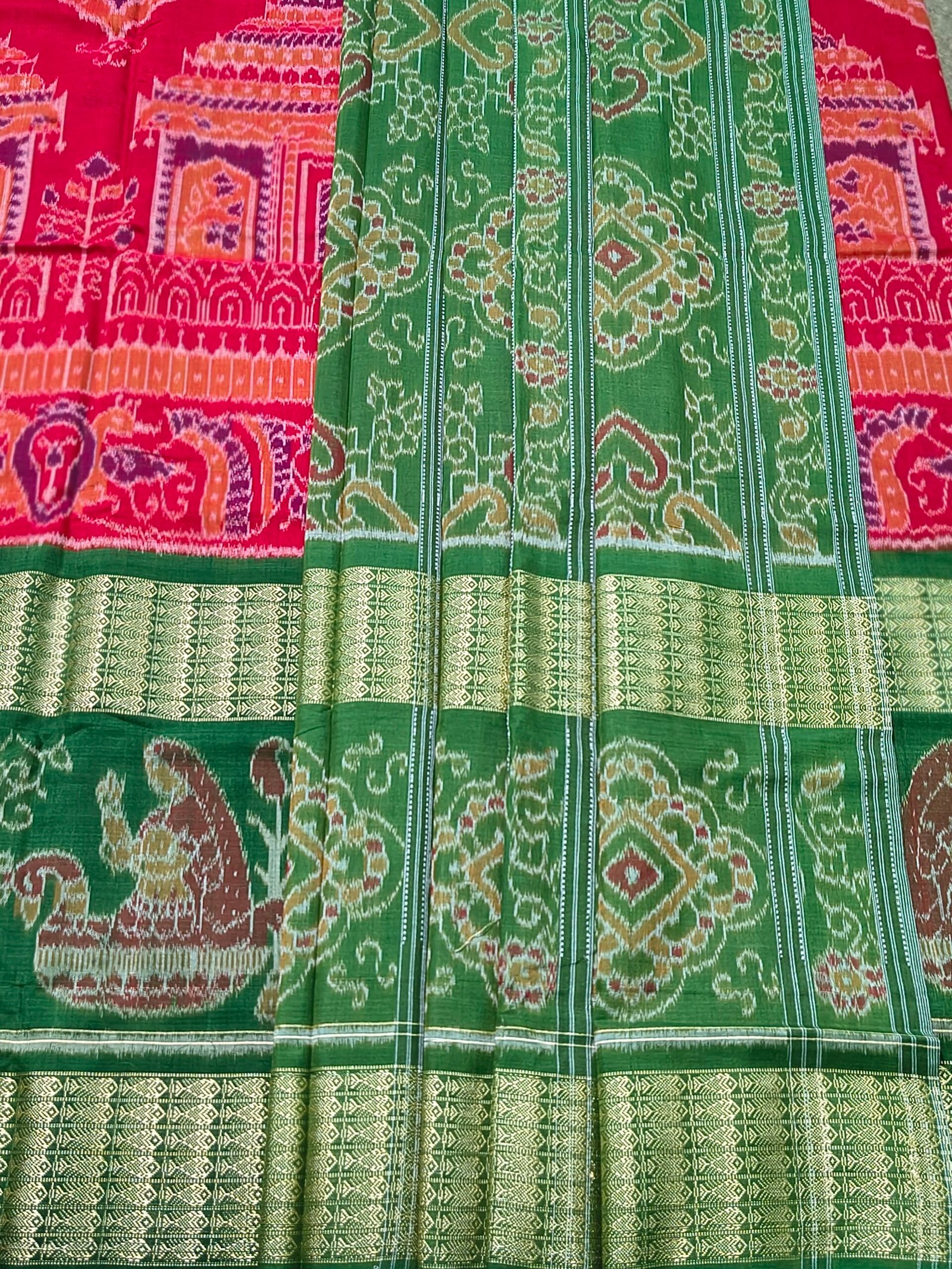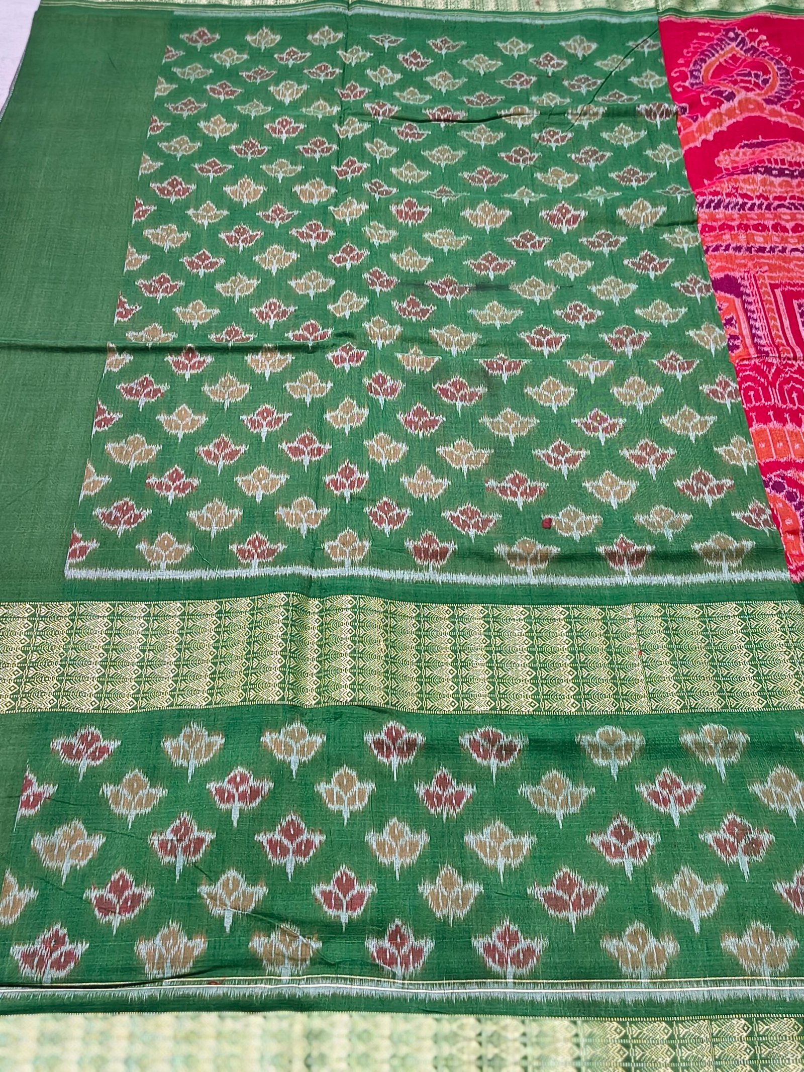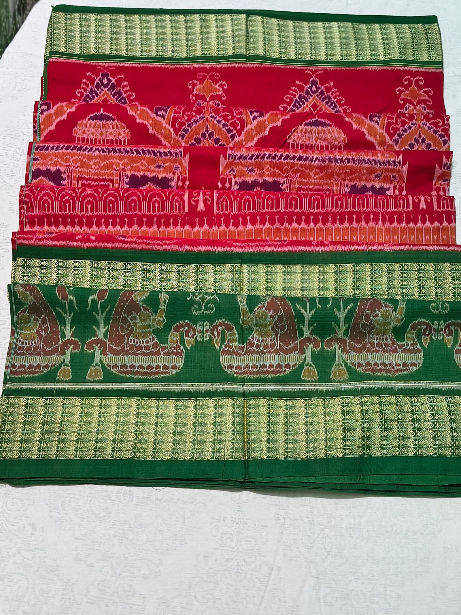 Red Green Ikat Tripple Macha border with design Blouse pc Sambalpuri Cotton Saree